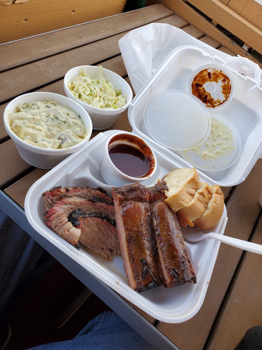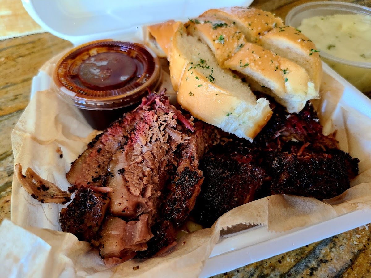 Great BBQ for the price! I had the Big Tex which comes with a choice of 4 meats & 4 sides along with cornbread or garlic bread. MEAT --Baby Back Ribs this was good and I'd get it again. I love ribs. --Brisket - I got this lean because I wanted "to be good/healthy" Obviously on the drier side. I have to try it more fatty next time. --Burnt ends - this was good. --Sausage hot links - I always enjoy sausage, this wasn't bad, but I've had better. SIDES --MUST GET the garlic mashed potatoes. This has to be their top side because it is amazing. --Macaroni & cheese. I'm like a child so I always get mac & cheese when I see it on the menu. --Coleslaw - this was okay, could pass on it next time. --BBQ beans - I liked this and would get this again. There is covered outdoor seating. They pack all of the food for to go, but it can be eaten outside. There is parking in front of the restaurant.