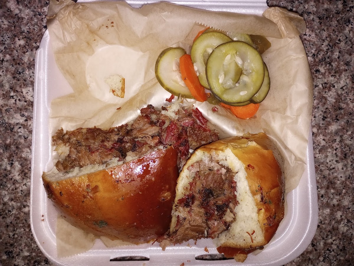 Cute lil place tucked away in between a gas station and neighborhood. GPS directed me to the alleyway behind it (where the smoker is) but they have street parking and a lil lot. Ordered takeout and it was ready in less than 20 minutes. They were so sweet and kind when I picked it up! I moved out to LA from Texas so I love me a great bbq spot We ordered: Brisket (lean): favorite thing of the night! Mmm Pulled pork: pretty good with sauce, a lil dry without Burnt ends (Moist): delicious! Very moist, some really fatty pieces (comes with territory) and some real meaty pieces (best part) Beans: okay, had meat in them Mac: meh, creamy sauce type Cornbread: fuego! Everything I love about a good cornbread The sauces were a star here! Spicy wasn't too different from the regular for me, but they had a sauce bar where you could try: fire, habanero, maple honey, vinegar, smoky honey mustard, +1 that slipped my mind . Fire was my fave